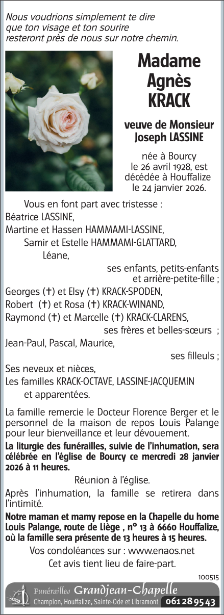 Décédée à Houffalize (6660) le samedi 24 janvier 2026 à l'âge de 97 ans