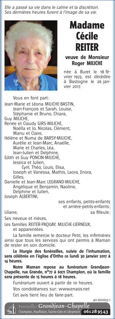Décédée à Bastogne (6600) le jeudi 26 janvier 2017 à l'âge de 93 ans