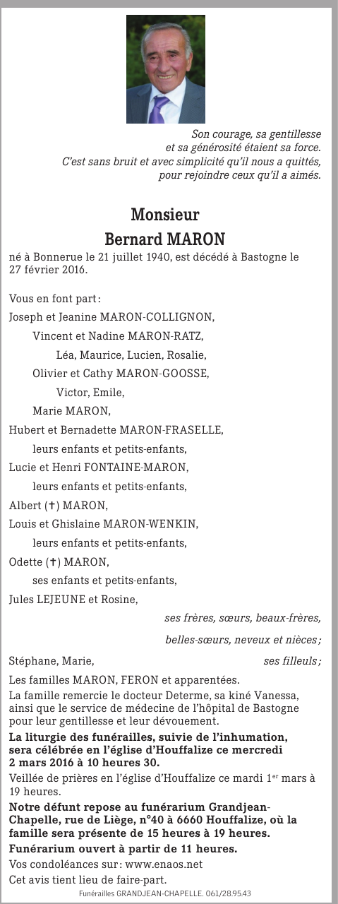 Décédé à Bastogne (6600) le samedi 27 février 2016 à l'âge de 75 ans