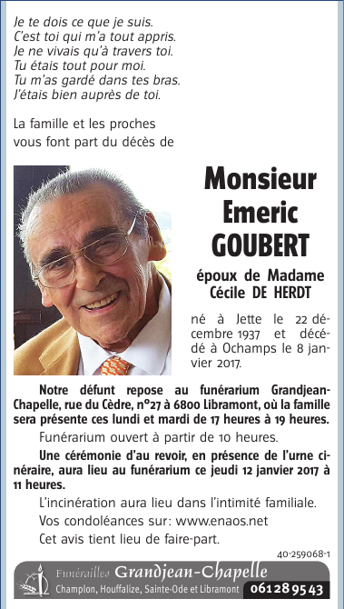Décédé à Ochamps (6890) le dimanche 8 janvier 2017 à l'âge de 79 ans
