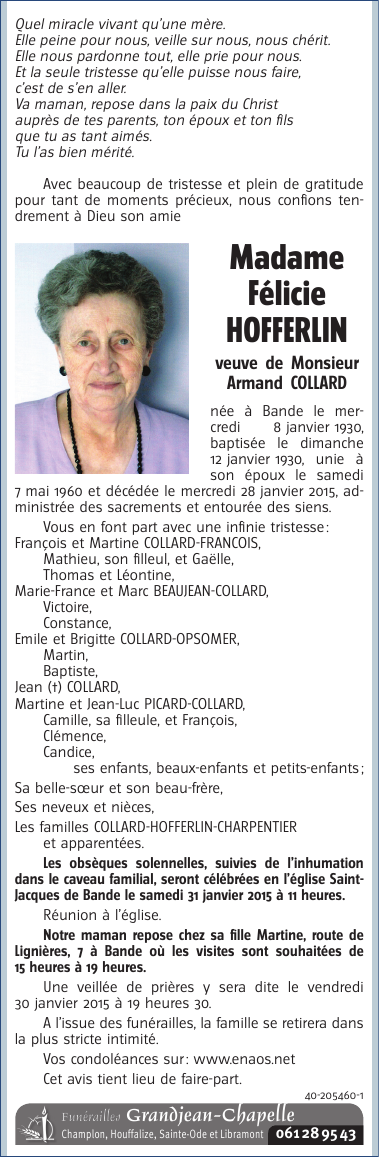 Née à Bande (6951) le mercredi 8 janvier 1930