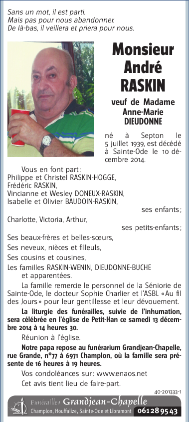 Décédé à Sainte-Ode (6680) le mercredi 10 décembre 2014 à l'âge de 75 ans