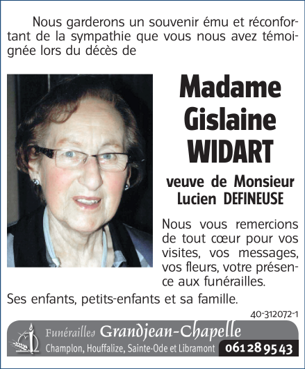 Madame Gislaine WIDART veuve de Lucien DEFINEUSE