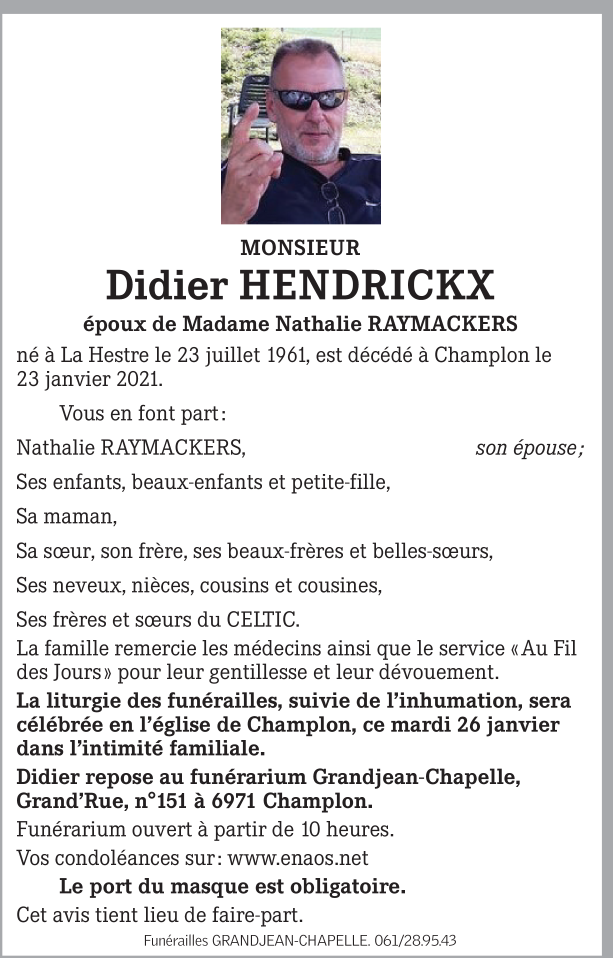 Décédé à Champlon (6971) le samedi 23 janvier 2021 à l'âge de 59 ans