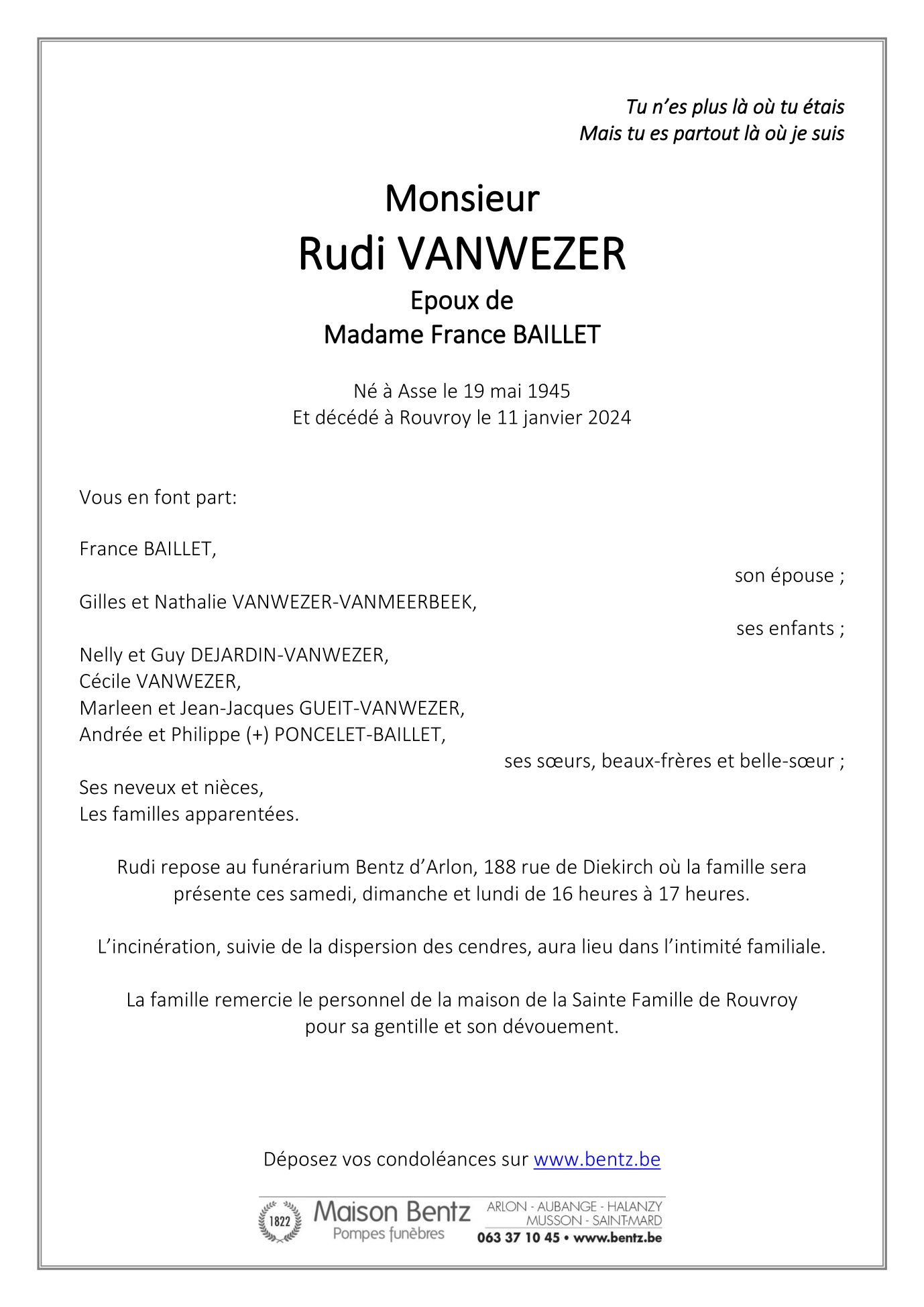 Décédé à Rouvroy (6767) le jeudi 11 janvier 2024 à l'âge de 78 ans