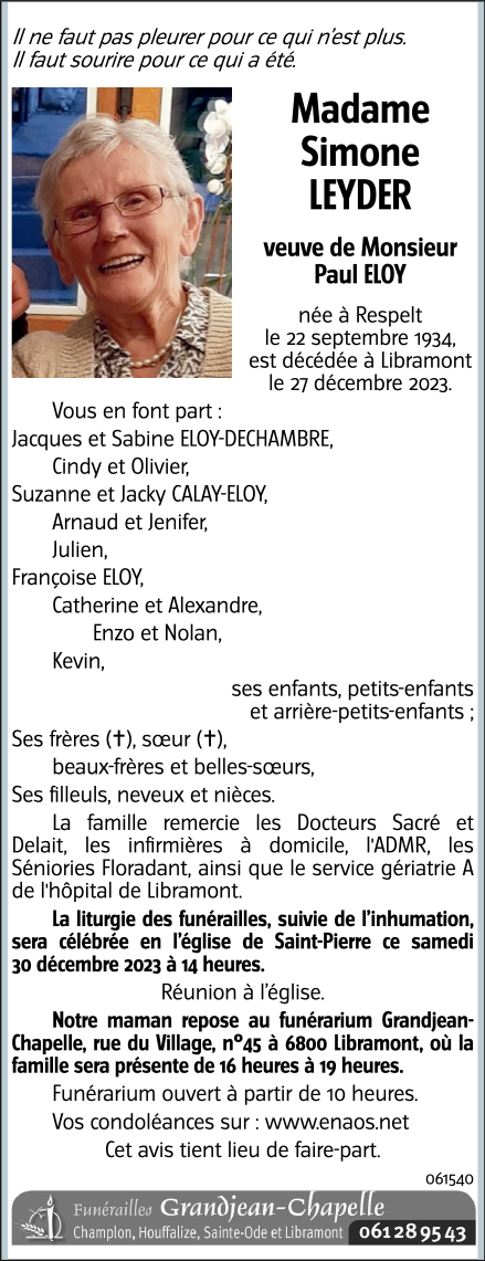 Décédée à Libramont (6800) le mercredi 27 décembre 2023 à l'âge de 89 ans