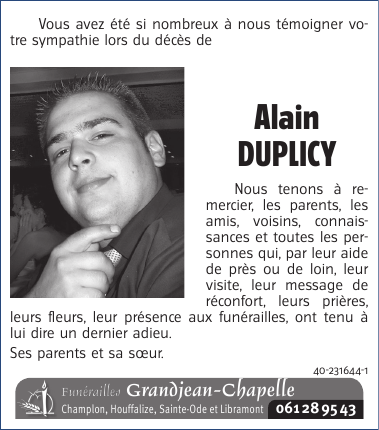 Décédé à Rosière-la-Petite (6640) le samedi 19 décembre 2015 à l'âge de 26 ans