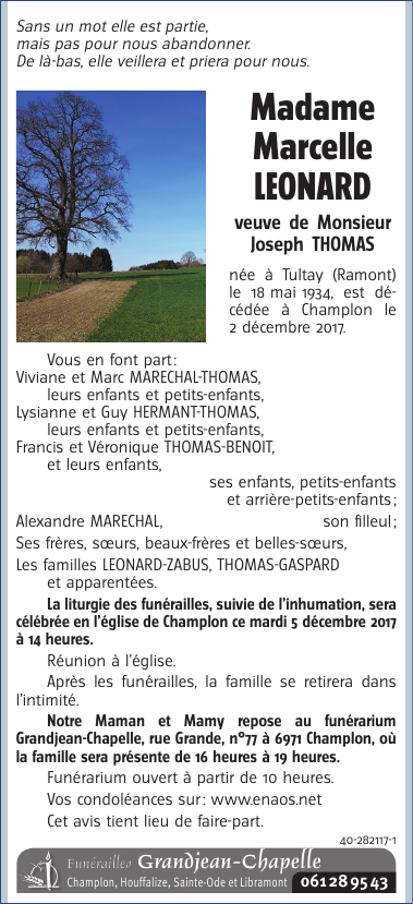 Décédée à Champlon (6971) le samedi 2 décembre 2017 à l'âge de 83 ans