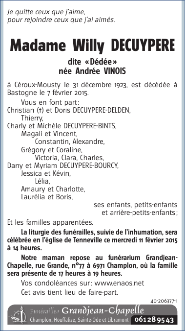 Décédée à Bastogne (6600) le samedi 7 février 2015 à l'âge de 91 ans