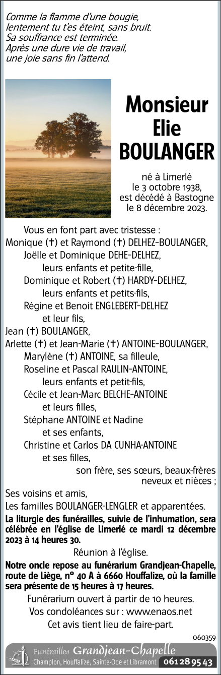 Décédé à Bastogne (6600) le vendredi 8 décembre 2023 à l'âge de 85 ans