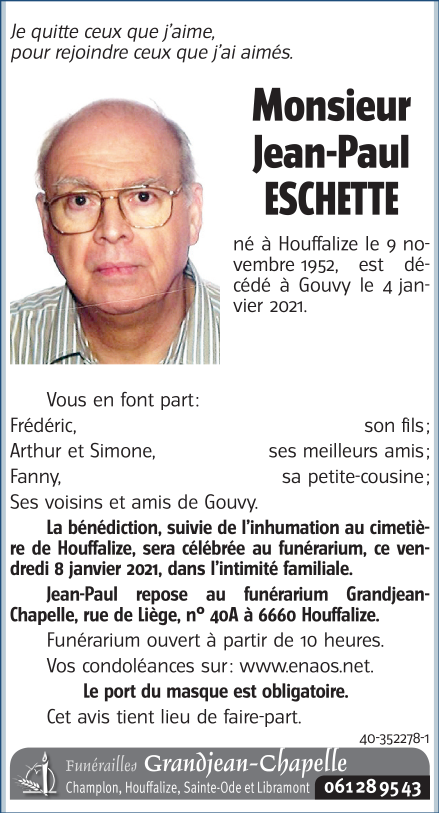Décédé à Gouvy (6670) le lundi 4 janvier 2021 à l'âge de 68 ans