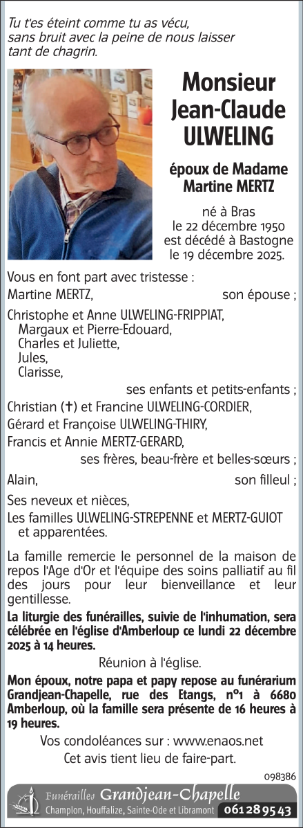 Décédé à Bastogne (6600) le vendredi 19 décembre 2025 à l'âge de 74 ans