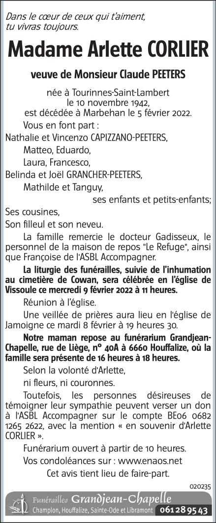 Décédée à Marbehan (6724) le samedi 5 février 2022 à l'âge de 79 ans