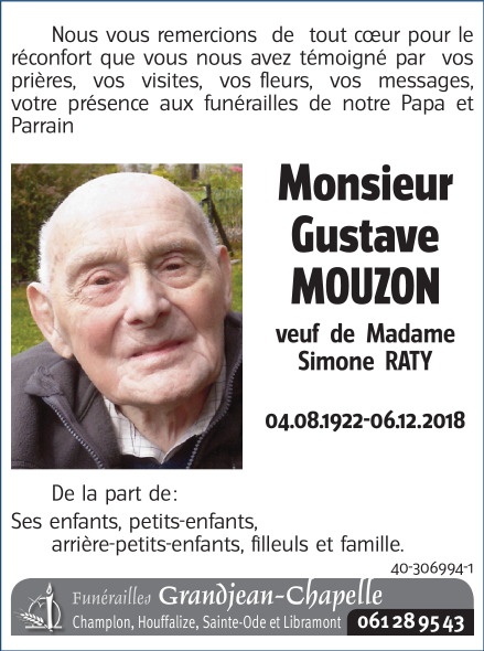 Décédé à Libramont (6800) le jeudi 6 décembre 2018 à l'âge de 96 ans