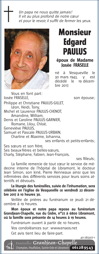 Décédé à Vesqueville (6870) le mardi 19 décembre 2017 à l'âge de 74 ans