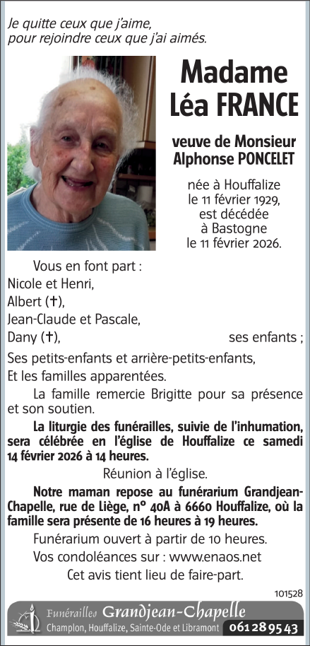 Décédée à Bastogne (6600) le mercredi 11 février 2026 à l'âge de 97 ans