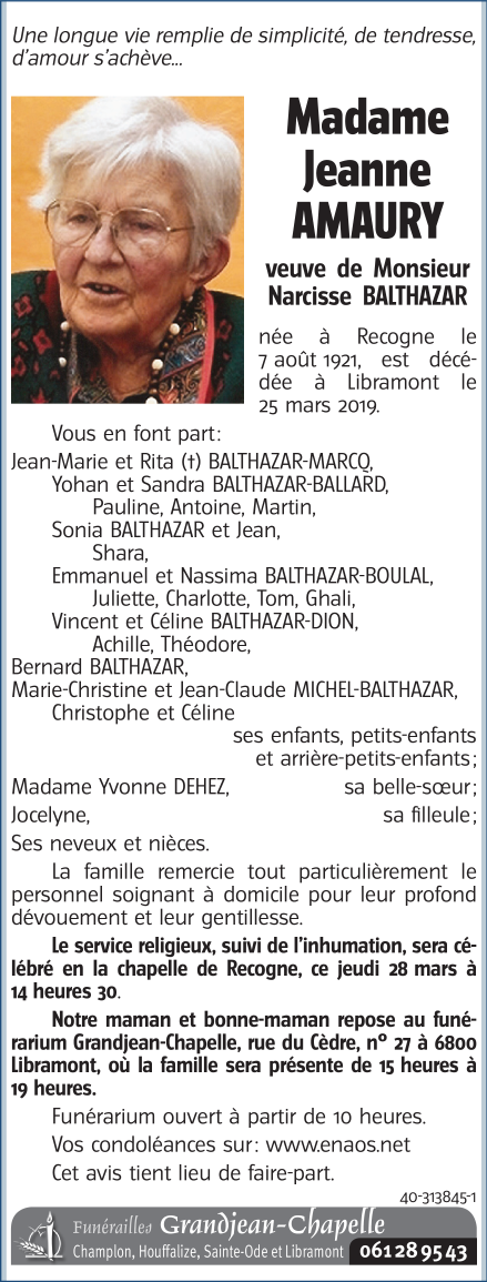 Décédée à Libramont (6800) le lundi 25 mars 2019 à l'âge de 97 ans