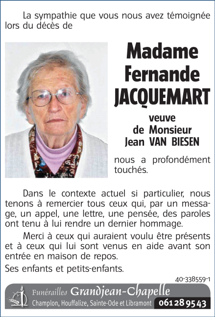 Décédée à Libramont (6800) le mardi 21 avril 2020 à l'âge de 96 ans
