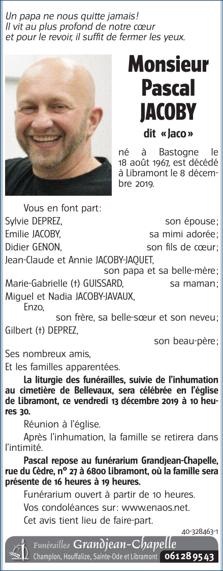 Décédé à Libramont (6800) le dimanche 8 décembre 2019 à l'âge de 52 ans