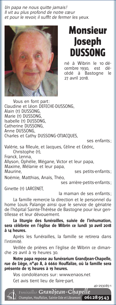 Décédé à Bastogne (6600) le vendredi 27 avril 2018 à l'âge de 87 ans