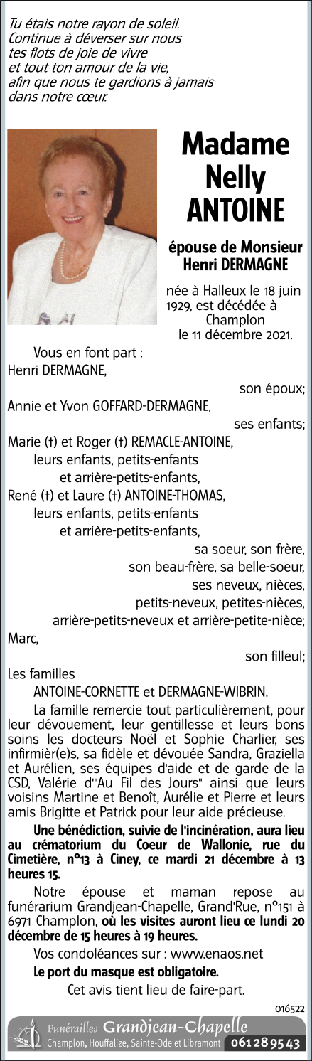 Décédée à Champlon (6971) le samedi 11 décembre 2021 à l'âge de 92 ans