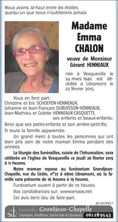 Décédée à Libramont (6800) le lundi 23 février 2015 à l'âge de 74 ans