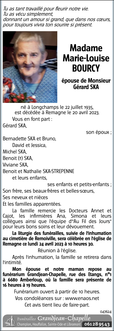 Décédée à Remagne (6800) le jeudi 20 avril 2023 à l'âge de 87 ans