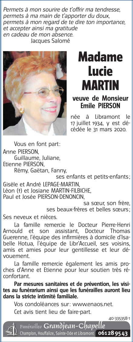 Décédée à Libramont (6800) le mardi 31 mars 2020 à l'âge de 85 ans