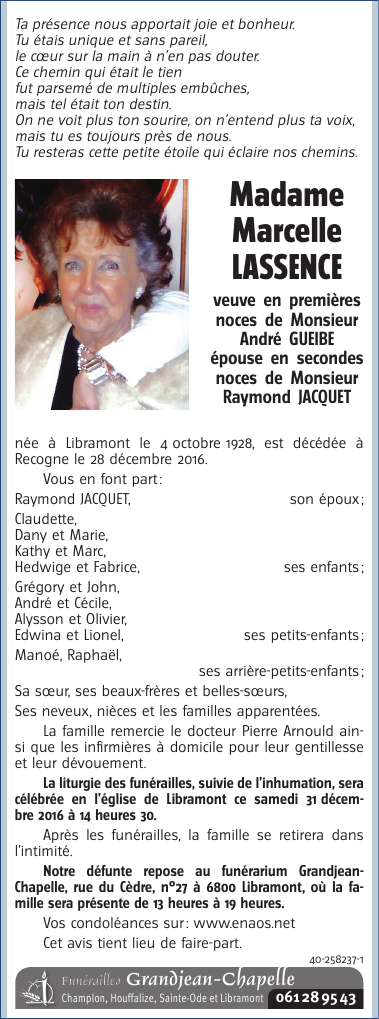Décédée à Recogne (6800) le mercredi 28 décembre 2016 à l'âge de 88 ans