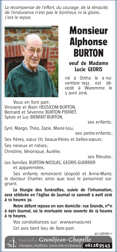 Décédé à Waremme (4300) le mardi 5 avril 2016 à l'âge de 83 ans