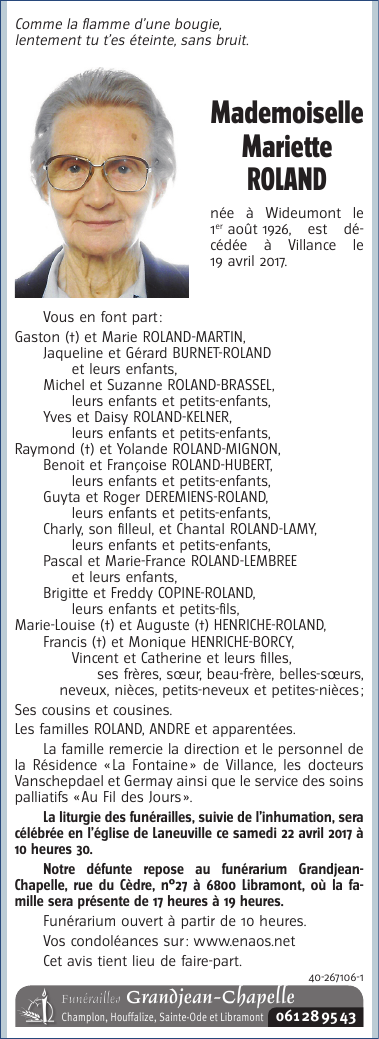 Décédée à Villance (6890) le mercredi 19 avril 2017 à l'âge de 90 ans