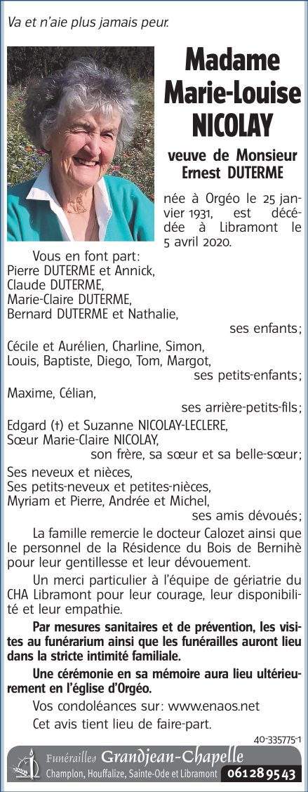 Décédée à Libramont (6800) le dimanche 5 avril 2020 à l'âge de 89 ans