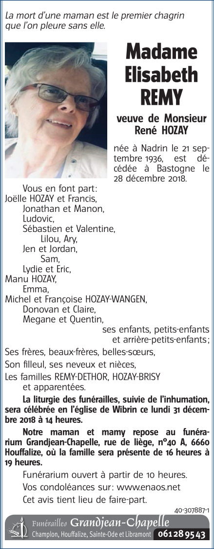 Décédée à Bastogne (6600) le vendredi 28 décembre 2018 à l'âge de 82 ans