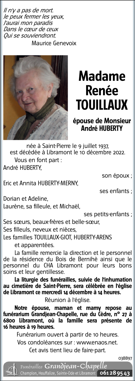 Décédée à Libramont (6800) le samedi 10 décembre 2022 à l'âge de 85 ans