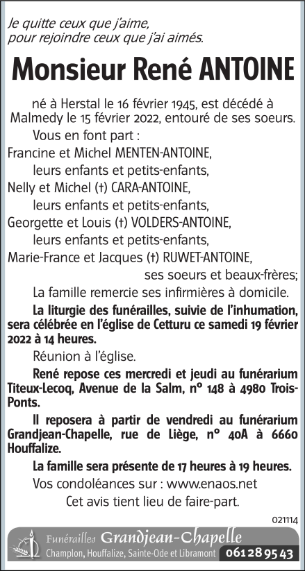 Décédé à Malmedy (4960) le mardi 15 février 2022 à l'âge de 76 ans
