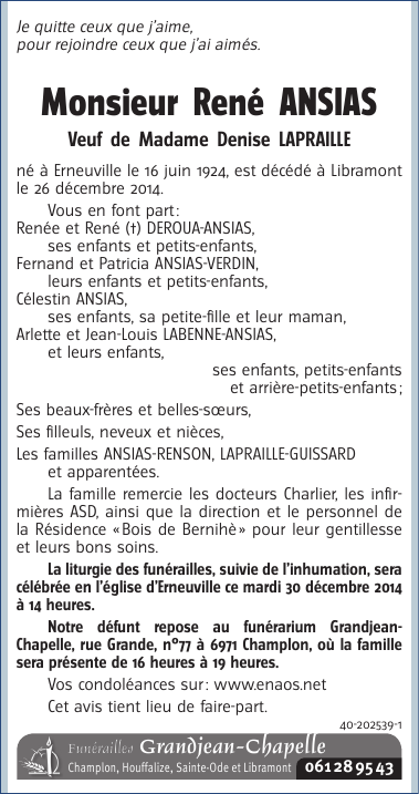 Décédé à Libramont (6800) le vendredi 26 décembre 2014 à l'âge de 90 ans