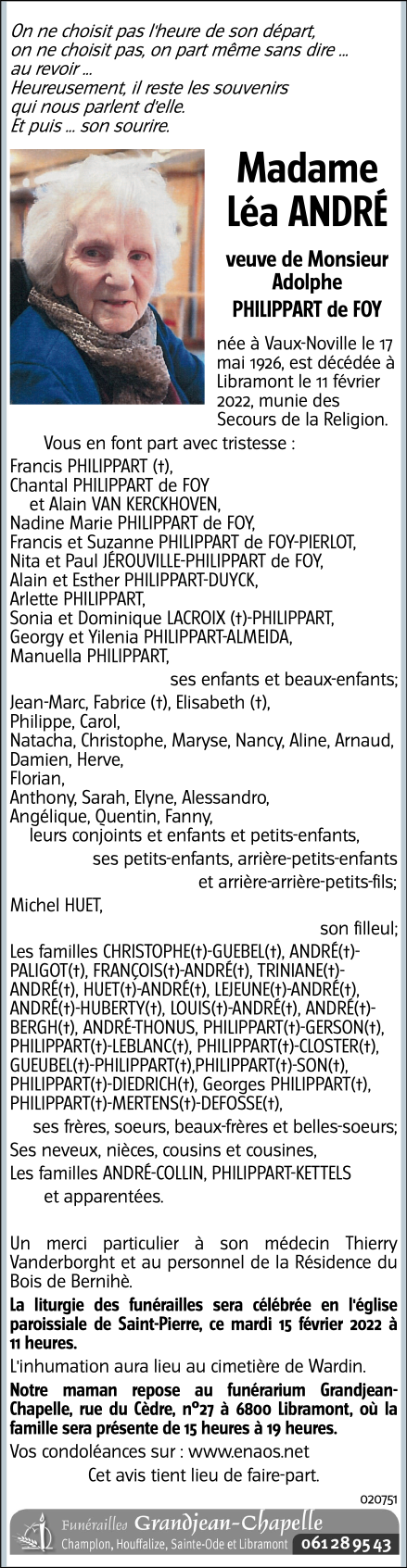 Décédée à Libramont (6800) le vendredi 11 février 2022 à l'âge de 95 ans