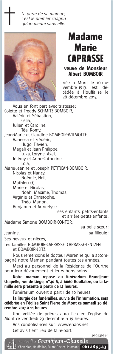 Décédée à Houffalize (6660) le jeudi 28 décembre 2017 à l'âge de 98 ans
