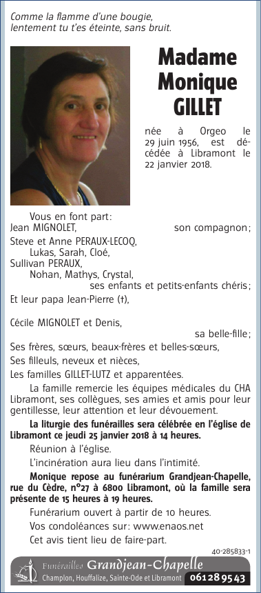 Décédée à Libramont (6800) le lundi 22 janvier 2018 à l'âge de 61 ans