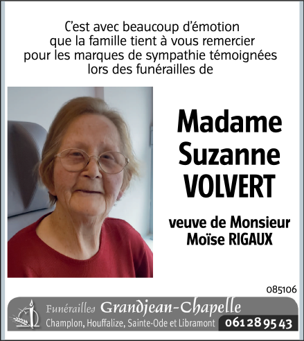 Décédée à Libramont (6800) le lundi 17 février 2025 à l'âge de 91 ans