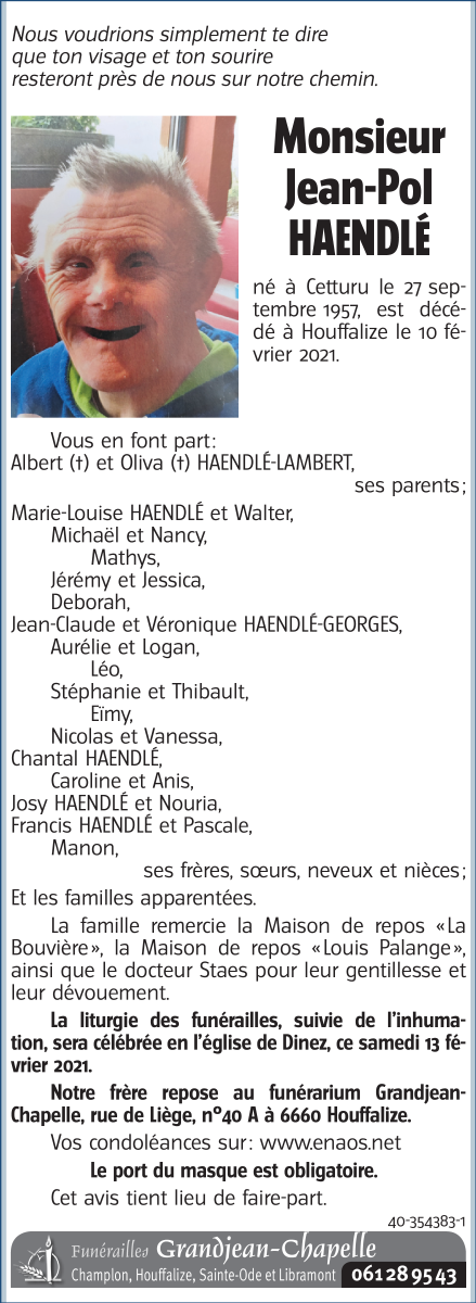 Décédé à Houffalize (6660) le mercredi 10 février 2021 à l'âge de 63 ans