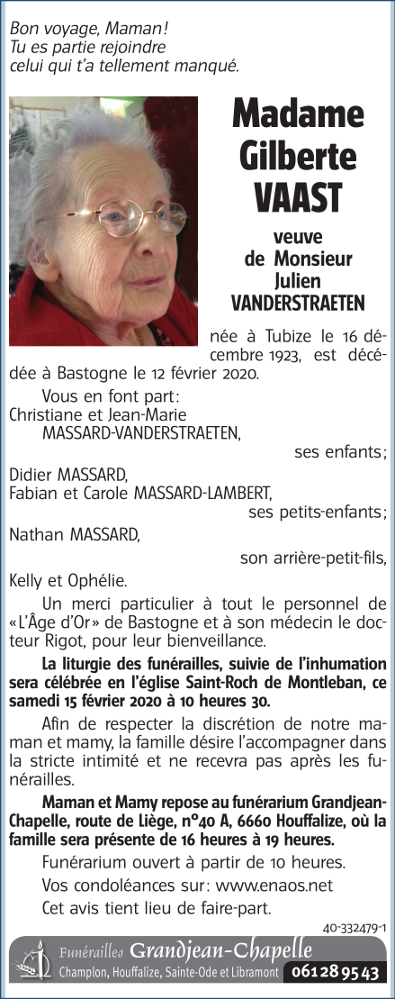 Décédée à Bastogne (6600) le mercredi 12 février 2020 à l'âge de 96 ans