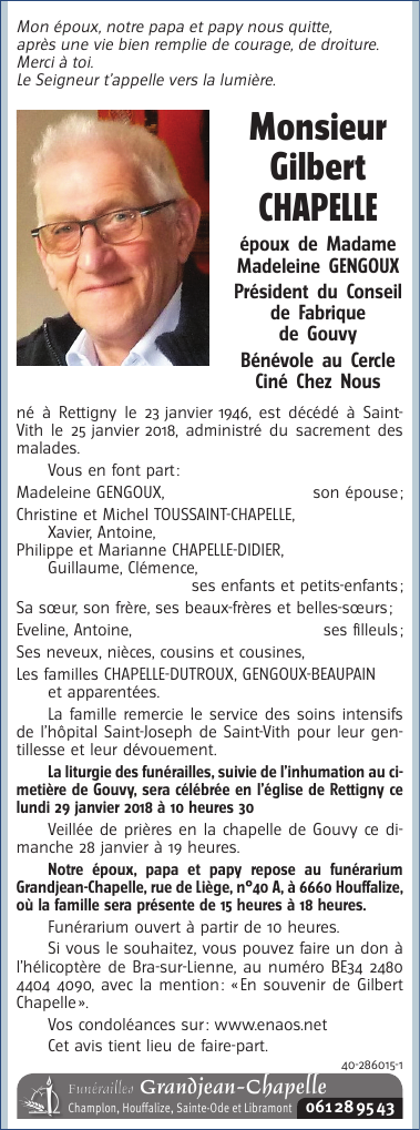 Décédé à Saint-Vith (4780) le jeudi 25 janvier 2018 à l'âge de 72 ans