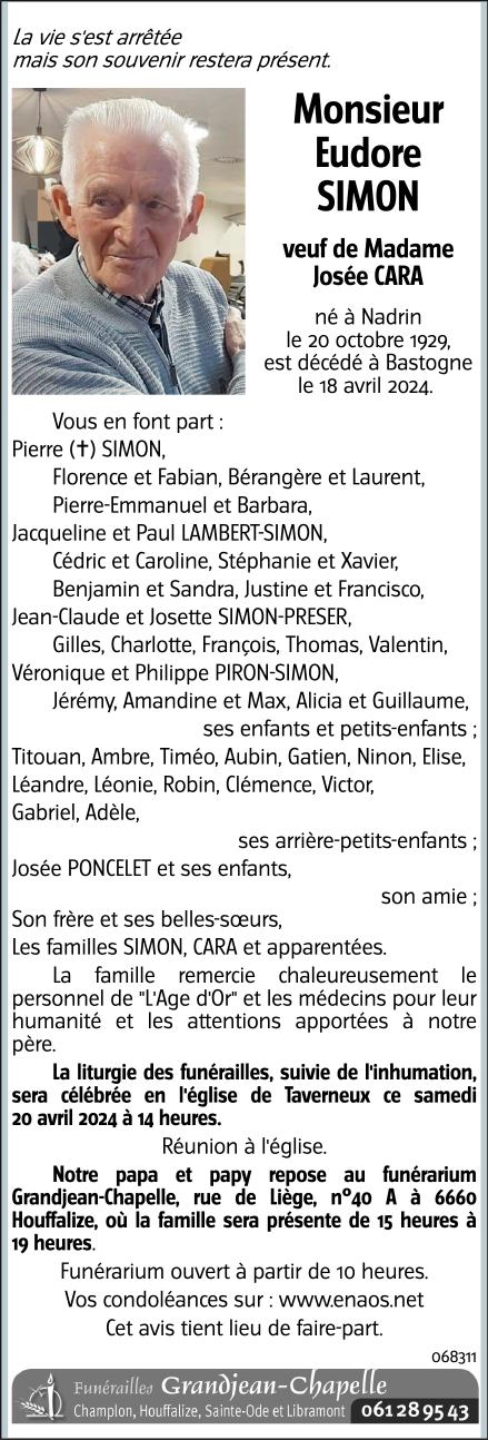 Décédé à Bastogne (6600) le jeudi 18 avril 2024 à l'âge de 94 ans