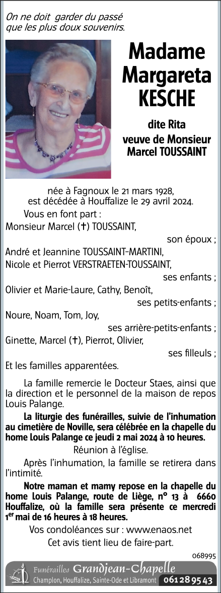 Décédée à Houffalize (6660) le lundi 29 avril 2024 à l'âge de 96 ans