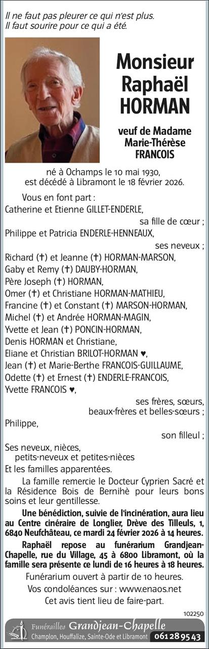 Décédé à Libramont (6800) le mercredi 18 février 2026 à l'âge de 95 ans
