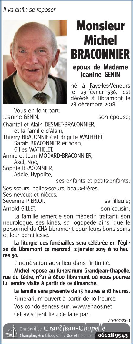 Monsieur Michel BRACONNIER époux de Jeanine GENIN
