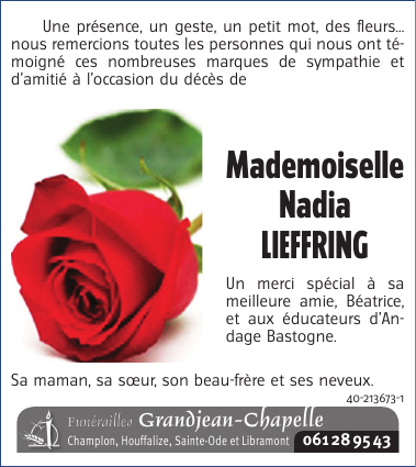 Décédée à Tonny (6680) le mardi 14 avril 2015 à l'âge de 44 ans