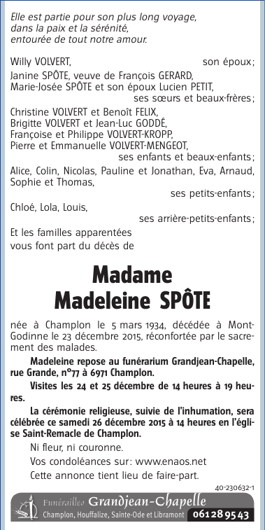 Décédée à Mont-Godinne (5530) le mercredi 23 décembre 2015 à l'âge de 81 ans