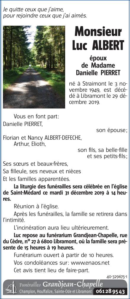 Décédé à Libramont (6800) le dimanche 29 décembre 2019 à l'âge de 70 ans